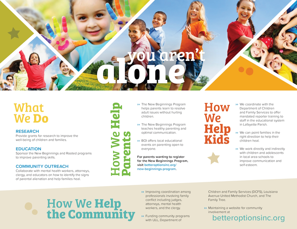 Better Options Initiative is a locally owned, therapy-based center designed for families with children who are going through separation or divorce. The services they provide are essential, and they have assisted hundreds of families in crisis through therapeutic education to eliminate harm to children associated with parental conflict.
